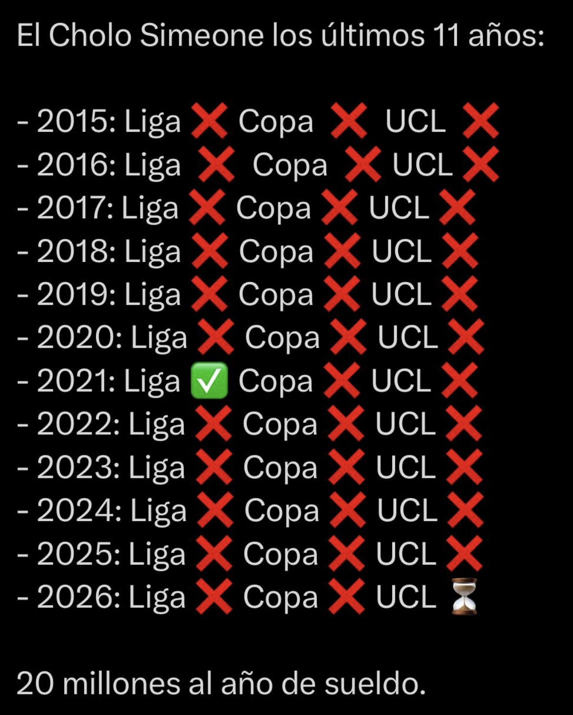 Diego Pablo Simeone, amigos, se levanta 200 millones al años. Esta es su cosecha de títulos.