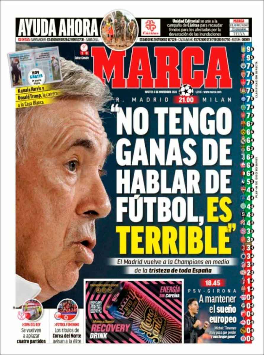 La portada de Marca se centra en la misma cuestión que la de Sport. Titula «No tengo ganas de hablar de fútbol, es terrible». Son más declaraciones de Ancelotti en la rueda de prensa de ayer. En la misma, alguien se encargó de preguntarle por el asunto de Vini y el galardón de France Footbal, a lo que Carlo respondió que «Vinícius está triste, como nosotros, pero no porque no haya ganado el Balón de Oro, sino porque está viendo lo que está pasando el Valencia».