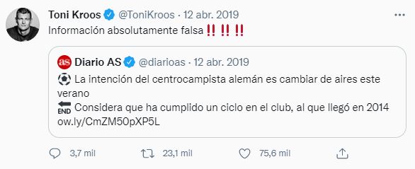 supuestas broncas en el vestuario o dudas sobre el entrenador. La prensa, o alguna prensa al menos, es el enemigo, luego no se pueden tolerar la mentira ni las dudas, que crean incertidumbre y desconfianza. El equipo tiene que ser un búnker. Esto que hizo Toni Kroos fue brutal y me gustaría que ocurriera más a menudo: