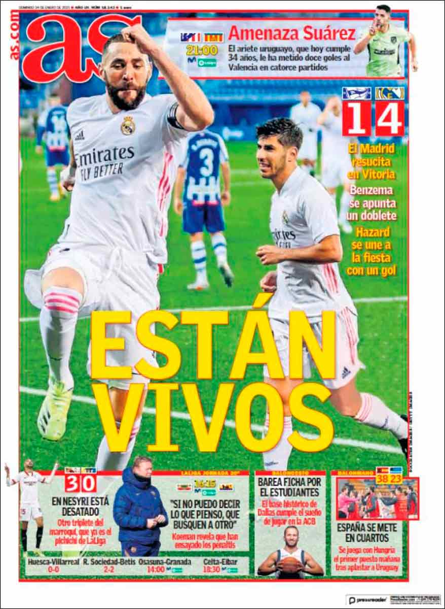 Mención especial, como casi siempre, merece Benzema, protagonista por mérito propio de ambas portadas tras marcar dos estupendos goles que confirman que si estuviéramos ante un jugador de fútbol estaríamos ante uno de los mejores, cuando en realidad estamos -lo hemos dicho otras veces- ante un bailarín, un coreógrafo, un artista del movimiento grácil, leve, aéreo. Esto es sabido incluso cuando Karim no marca; esto es glorioso cuando anota dos goles para que los que solo saben de cuentas también sepan de baile.