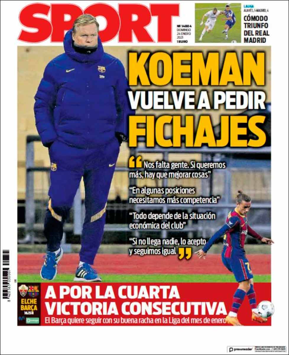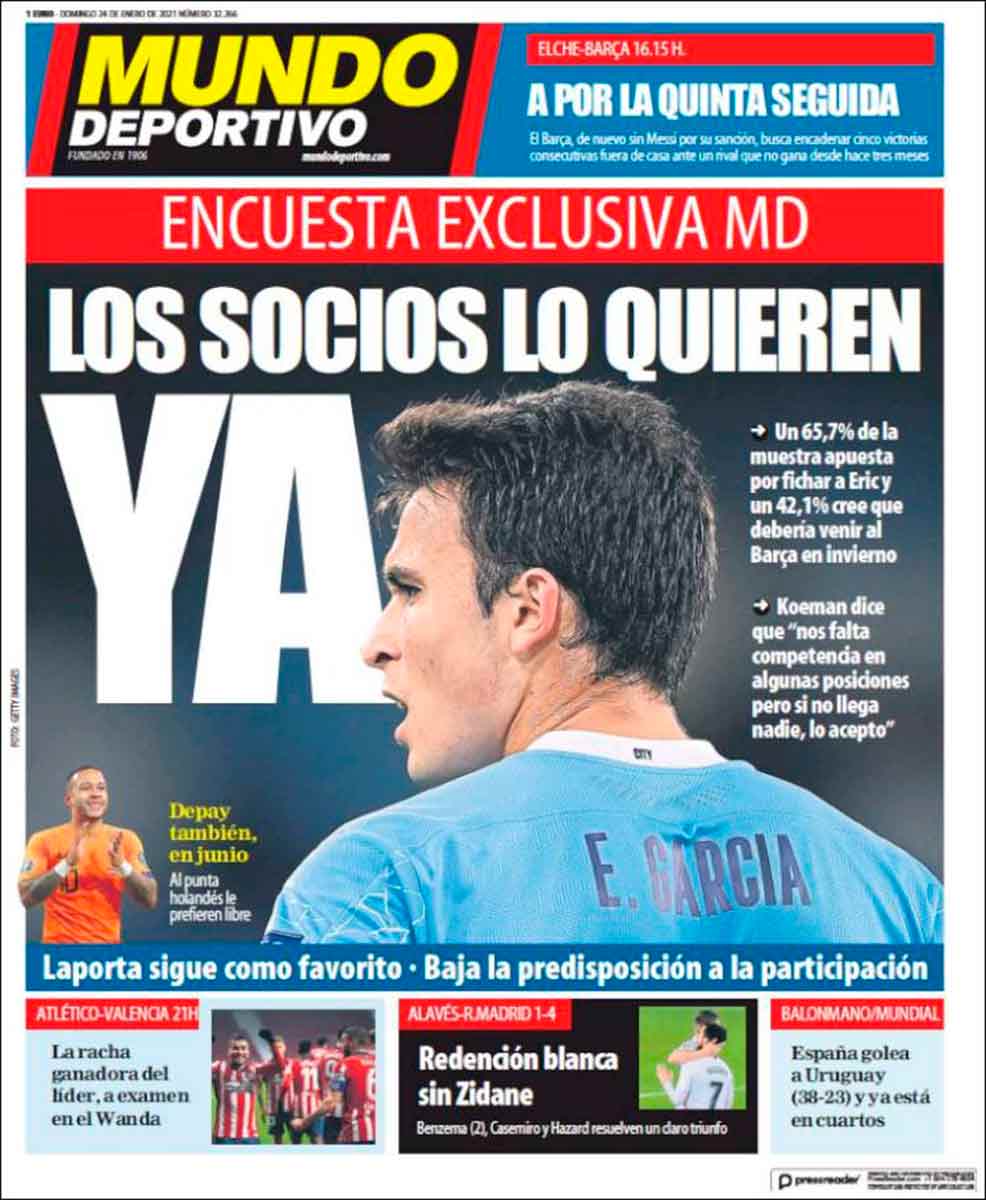 Koeman pide fichajes desde la portada de Sport y Eric García y Depay se le conceden desde la portada de Mundo Deportivo. Dicho y hecho. Así se las gastan en la prensa deportiva culé. Que no falte de nada, salvo el dinero para esos fichajes, claro. Pero qué es el dinero más que vil metal para atraverse a poner límites a lo que quiera el socio, el entrenador y la propaganda. Ya puestos, reconocemos estar un poco aburridos de ver a Eric García en las portadas y añoramos el eterno retorno del hijo del padre de Neymar Jr., que tanto nos alegró la vista durante días, meses, años.
