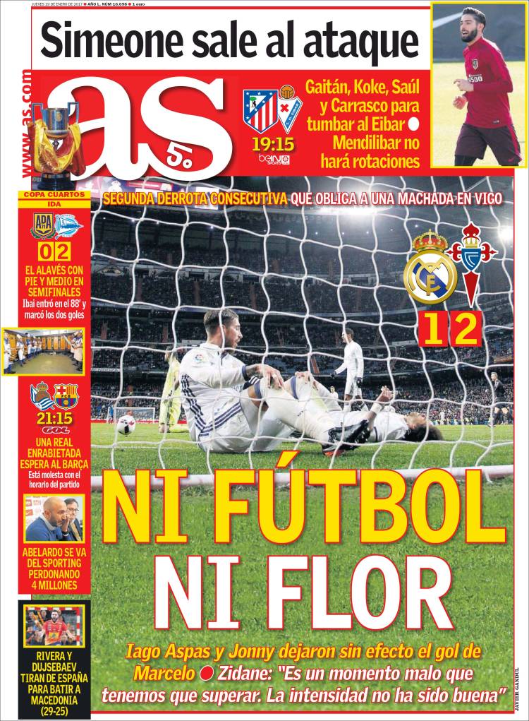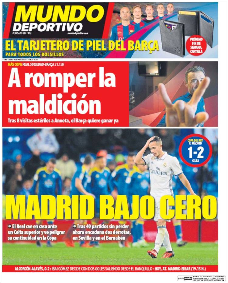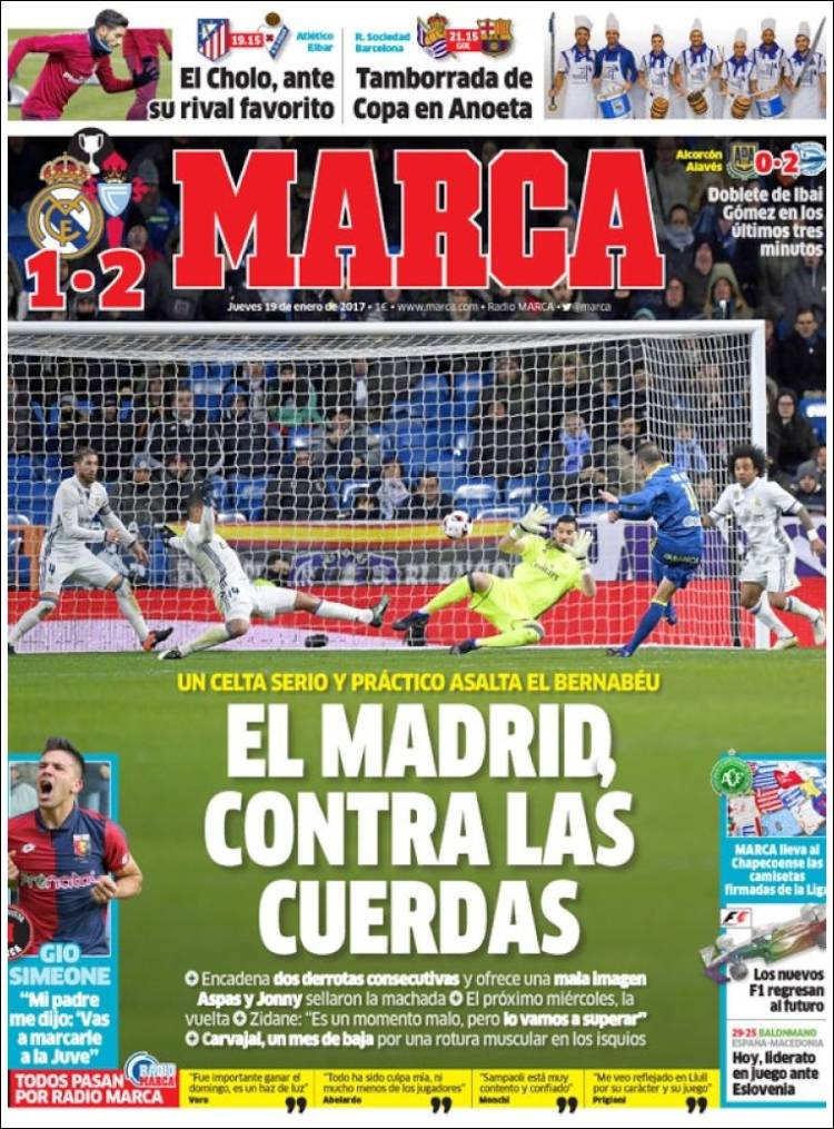 Buenos días. Hoy no nos vamos a detener mucho en las portadas porque el Madrid ha perdido otra vez, aunque parezca mentira después de la racha de imbatibilidad que acabamos de dejar atrás. No queremos escudarnos en la habitual crítica a la prensa para negar o disfrazar que el Real Madrid hizo un mal partido y que tiene muy complicada la clasificación para las semifinales de la Copa del Rey. El buen tono general del medio campo (Modric ha logrado que deje de ser noticia el que se muestre imperial) no se vio acompañado por una actuación ni tan siquiera pasable en ambas áreas, donde hay mucho que analizar. Nos metieron dos goles absolutamente imputables a sendas negligencias defensivas de complicada disculpa, y perdonamos frente al portero rival goles que un delantero del Real Madrid no debe fallar jamás, aunque fallar pueda fallar cualquiera.