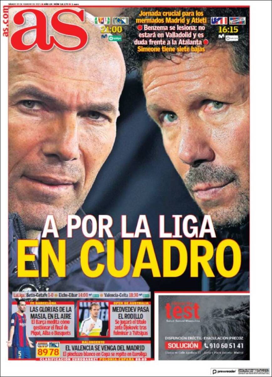 Y en un recuadrito (superior derecho) “el más difícil todavía para Zidane sin Benzema”. Algo parecido, pero en grande y con Simeone de pareja es lo que nos muestra As. A POR LA LIGA EN CUADRO. “Benzema se lesiona”, “jornada crucial” y “siete bajas” para el Cholo. Pobre. ¿Siete? Qué barbaridad. Siete bajas. Qué locura. Siete. Lo que no vemos por ninguna parte es la mención a las OCHO, sí, OCHO bajas que tiene el Madrid para hoy. Ocho para hoy. Que siete son muchas, sí. Pero ocho son más, queridos amigos de As.