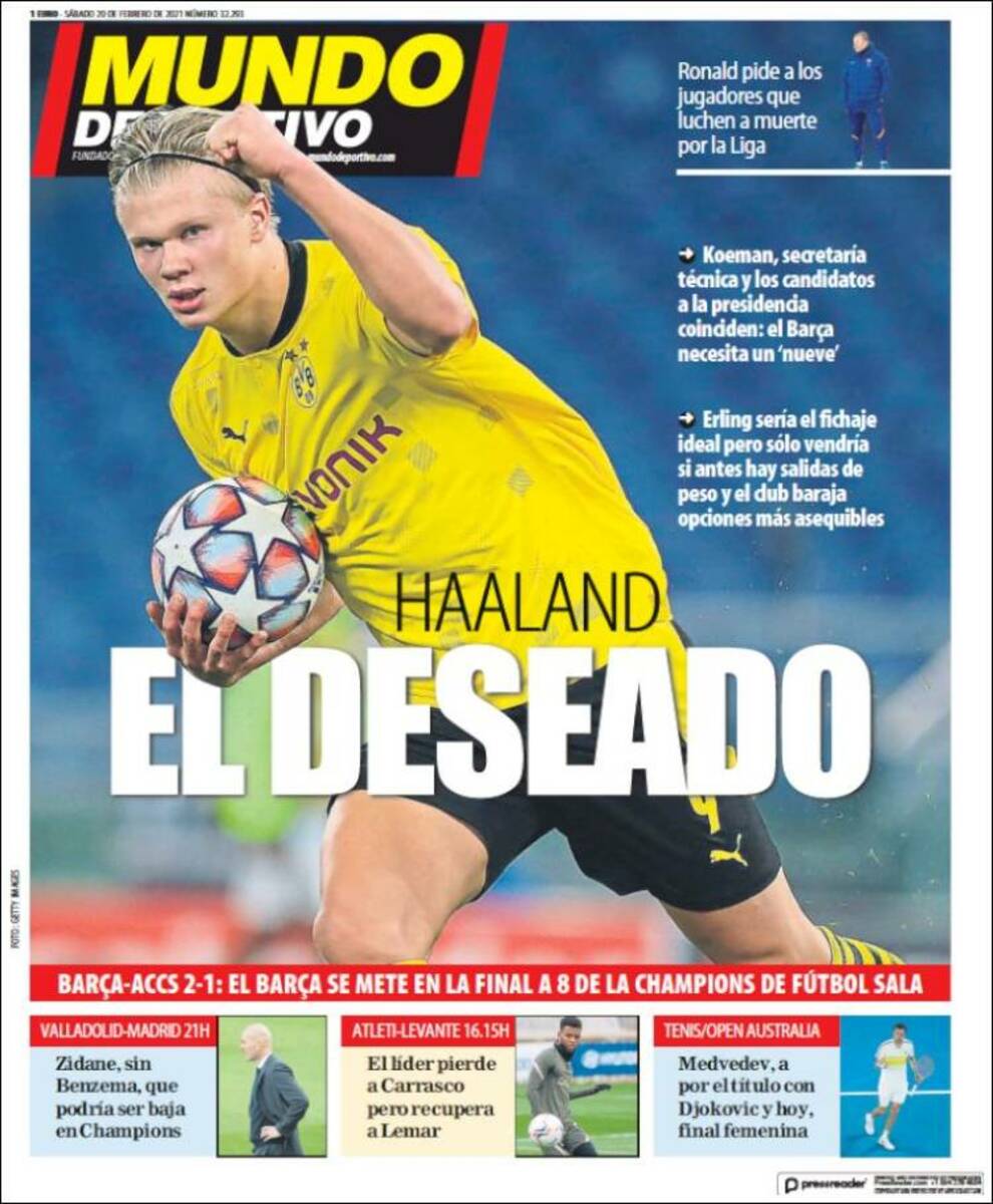 Aunque para gracia ya nos adentramos en la auténtica dimensión. As suele ser un preámbulo de la gracia (a veces incluso es la misma gracia), pero el cataculerismo es su culmen. Ved, ved cómo aparece HAALAND EL DESEADO (sin coma, ni zarandajas) en Mundo Deportivo. Pero si esto es gracioso, lo que no hay que perderse son los subtítulos: “Koeman, secretaría técnica y los candidatos a la presidencia coinciden: el Barça necesita un ‘nueve’” y “Erling sería el fichaje ideal pero sólo vendría si antes hay salidas de peso y el club baraja opciones más asequibles”.