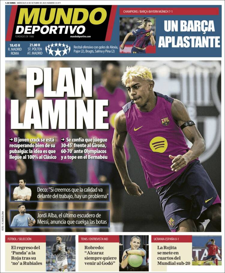 Por su parte Mundo Deportivo, el diario de Godó, Grande de España, sigue a vueltas con Lamine Yamal y su extraña lesión, que hay que añadir a los recurrentes problemas en esa muñeca que tanta lata le dan. Parece ser que es una pubalgia. Una muñeca vendada y un dolor inguinal no son síntomas que, combinados, deban extrañar demasiado en un chico de dieciocho años. Un poco de bromuro en el cola-cao y a jugar el mal llamado clásico, donde estará en luego media MLN.
