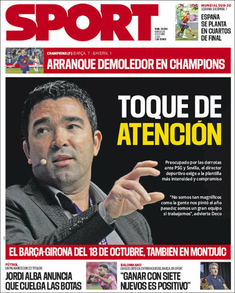 Sport abre con unas declaraciones de Deco, director deportivo del club cliente de Negreira, que ha puesto a caldo a sus jugadores tras las derrotas ante PSG y Sevilla, reclamándoles más trabajo. Deco se parece un poco a Peter Lorre y sus palabras han sembrado la discordia en el seno del culerío, si bien amabs variables son en principio independientes.