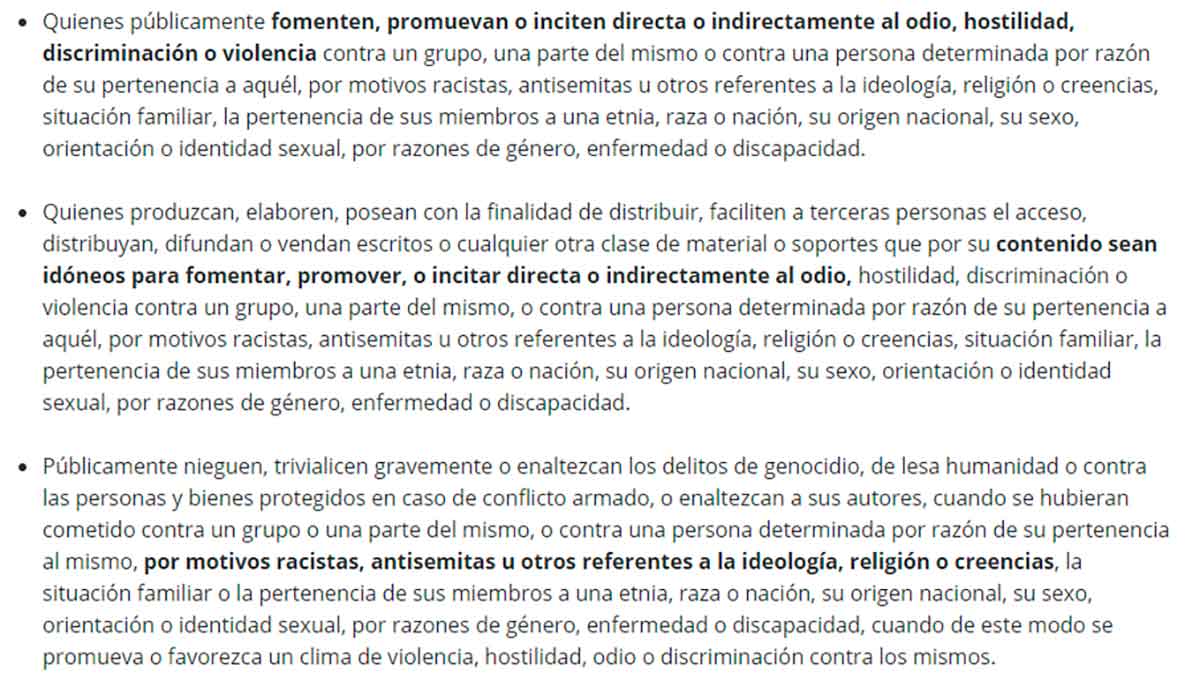 EL Código Penal tampoco está por la labor de trivializar el racismo y tipifica el delito de odio, aunque según qué Fiscalía si es durante unos pocos segundos no pasa nada. Recordemos el Capítulo IV, Sección I, Artículo 510 del mismo que castiga estos delitos con una pena de prisión de uno a cuatro años y multa de seis a doce meses: