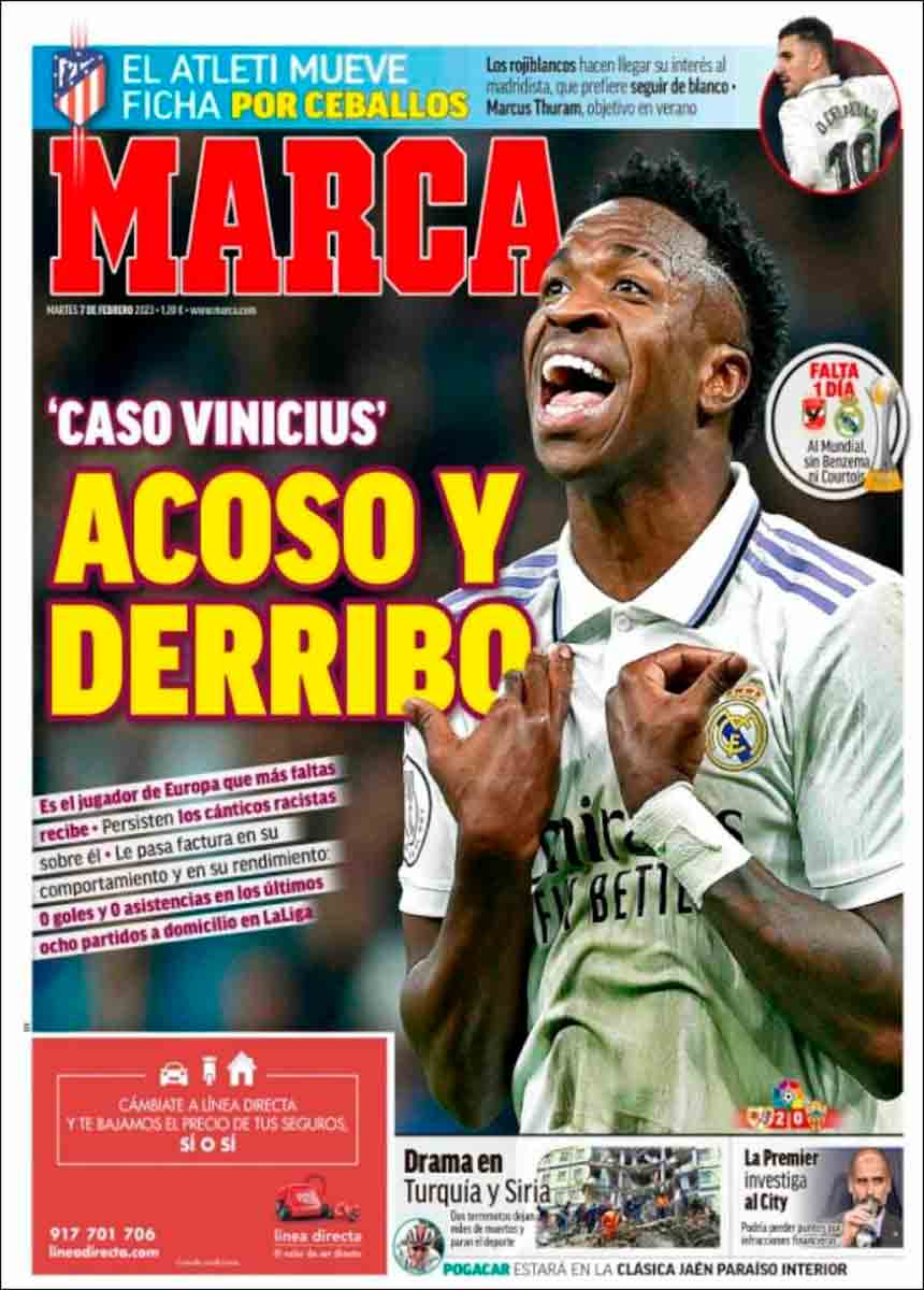 “Acoso y derribo”, titula Marca sin que observemos que se les caiga la cara de vergüenza. Aseguran que el hecho de ser el jugador de Europa que más faltas recibe y que sufra cánticos racistas le pasa factura en su COMPORTAMIENTO y en su rendimiento. ¿En su comportamiento? ¿Nos podéis explicar, por favor, qué ha hecho “mal” Vinícius? Vinícius no ha cometido ningún delito de odio, aunque sí los ha sufrido; Vinícius no ha agredido físicamente a ningún rival, aunque él sí ha sido agredido; Vinícius no ha sido captado por las cámaras mofándose bobaliconamente de un contrario, aunque algún programa nocturno así lo afirme de manera recurrente y siempre sin NINGUNA prueba, pese a existir decenas de cámaras y micrófonos en cada partido.
