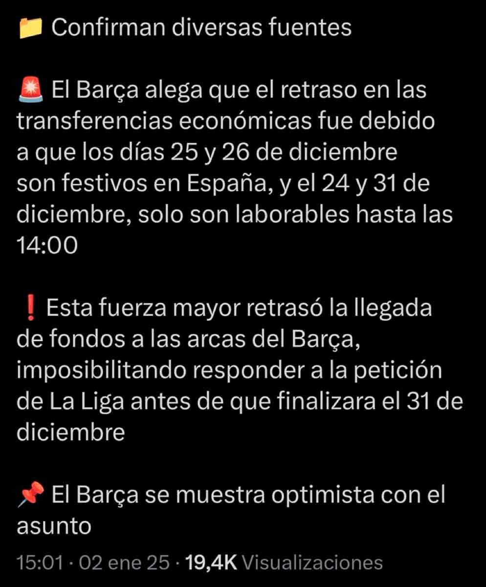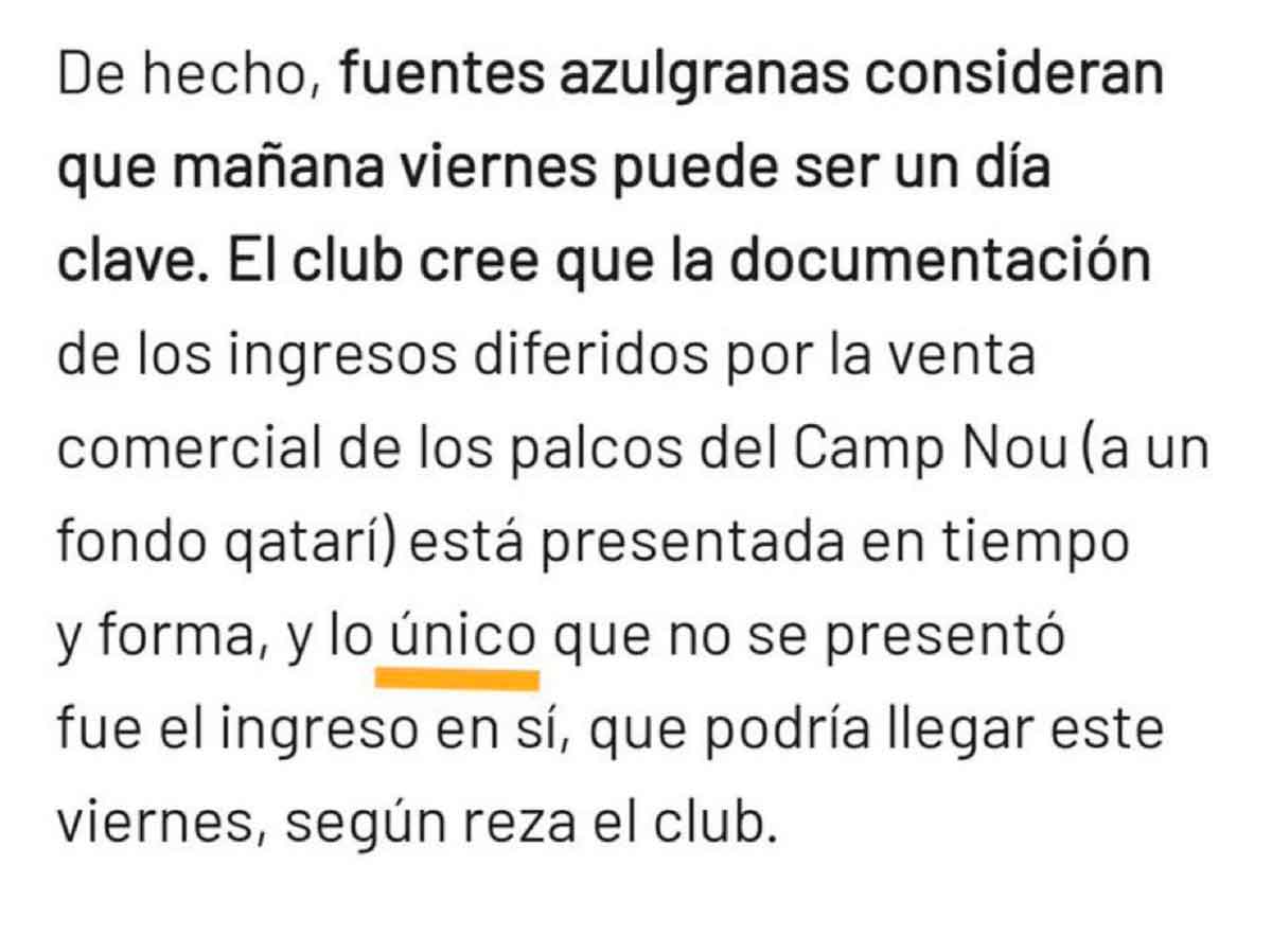 Los plazos deben ser flexibles, de acuerdo a la doctrina dictada por Laporta a sus escribidores más cercanos, porque en la presentación de las pruebas de que se ha ingresado el dinero proveniente de Oriente Medio para la inscripción de Olmo (y Pau Víctor) ha habido retrasos producidos por “fuerza mayor”.