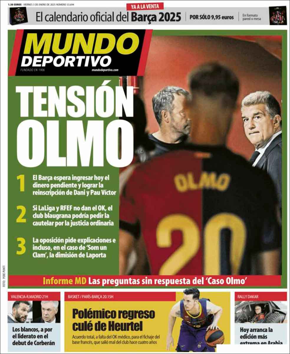 “Tensión Olmo”, titula Mundo Deportivo, en el alarde hitchcockiano mencionado. ¿Estallará la bomba o no? A todo esto, la bomba ya ha estallado, que es lo más gracioso de todo. Era una bomba de relojería que explotó a las doce de la noche del 31 de diciembre, tal y como había sido programada, pero este país, con su prensa deportiva a la cabeza, está abrazando la ficción de que no lo ha hecho, como si los plazos fueran una cosa flexible. Bueno, qué cosas decimos. Lo son por definición para el club cliente de Negreira, como lo son las normas.