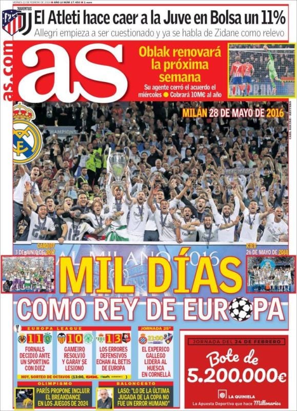 Y es que hablamos del Rey de Europa como quien no quiere la cosa y resulta que el reinado blanco suma ya mil días de gobierno consecutivo. Acojonante. No se nos ocurre otra palabra. A nosotros nos impresiona profundamente y nos deja estupefactos y a nuestros enemigos los acobarda de acuerdo con la definición y acepciones de la RAE . Se trata de un hito de tal magnitud que no solo la Ouija lo traslada a portada, en un día más en su oficina sin sacar noticia alguna, sino que Relaño croquetea con el asunto desde su púlpito.