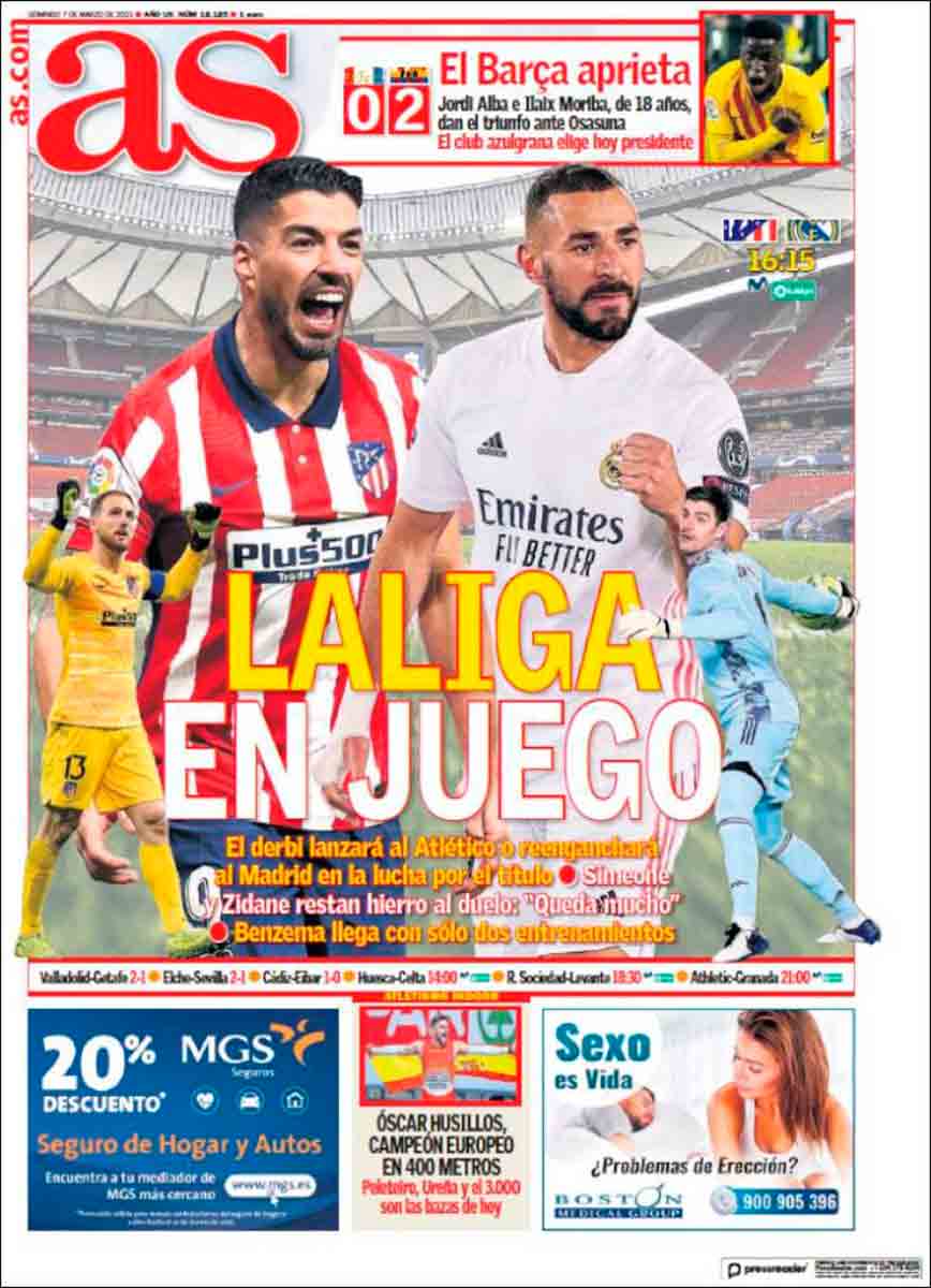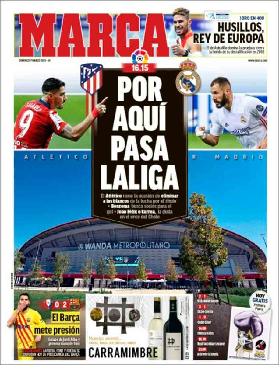 Efectivamente, como bien reflejan As y Marca, por aquí pasa la Liga, que en apenas unas horas estará en juego. Sabemos bien que aún seguirá en juego pasadas aún dos horas más, pero sabemos mejor que su estar en juego será bien deferente si el Real Madrid gana al Atlético en su casa y se coloca ya bien cerca de los colchoneros en la tabla. Tan cerca que las matemáticas ya dirán menos que la historia. Tan cerca que los puntos serán un dato menor que la certeza de que el Madrid siempre vuelve, aun más cuando una inmensa mayoría (de desleales, de olvidadizos o de malintencionados) se empeña en insistir en lo lejos que está de volver.