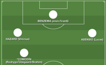 Benzema en punta, en las bandas Vinicius y Hazard saliendo de banda derecha y con libertad total en ataque recordemos el que metió esta temporada: tremendo golazo de Hazard al liverpool partiendo de banda derecha.
