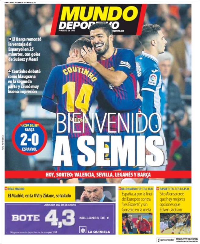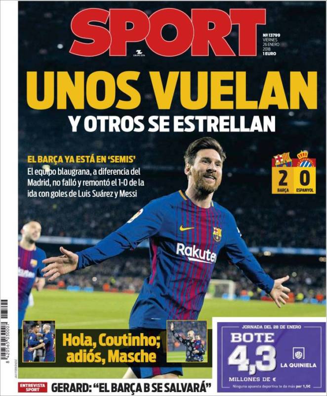 Buenos días. Empezamos así, a bocajarro. ¿Qué sentís? ¿Qué os transmite este ejercicio de debilidad mental? "Unos vuelan y otros se estrellan". No cada cosa por su lado. No. No un gran titular para la clasificación del Barça para semifinales de Copa y otro más discreto para insistir en la hecatombe blanca ante el Leganés sino un titular para las dos cosas porque ambas representan una fuente de gozo de la misma magnitud para estas almas mediocres, incapaces de disfrutar de sus propios éxitos si no van acompañados de la debacle del rival. Es la envidia, la ordinariez, la sarna, la grosería, la horterada, el mal gusto. Todo en uno.