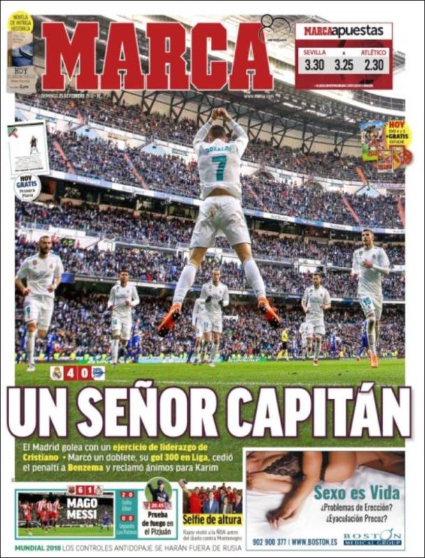 Si de talento hablamos, dejemos las minúsculas del as y pasemos a las mayúsculas de un Cristiano que hace semanas que ha vuelto a encontrarse consigo mismo, ahora que empieza a llegar lo decisivo de lo que tiene que llegar (mención especial para la estupenda foto de portada que hoy nos trae Marca). Sus compañeros también parecen haber afinado sus instrumentos y, a la vez, contar con sus armas de asalto en perfecto estado de revista (ya saben, la proverbial pegada: esa media verdad que es el único ¿elogio? admitido como políticamente correcto para aplicarlo al Real Madrid). Lo de ayer fue una delicia. No solo vimos a la BBC exhibiendo letras mayúsculas, sino también, por citar un ejemplo destacado, a nuestro querido Lucas V pleno de esa virtud que hace regalos, sonrisa en ristre como báculo que separa el bien del mal.