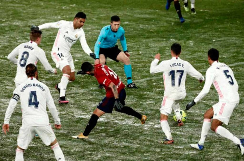 El Madrid enfrentaba un partido en el que todo le fue adverso desde el propio viaje. La Liga le pidió viajar el mismo viernes, un día antes de lo previsto, pero el avión no pudo salir hasta 4 horas después con el cabreo de los jugadores, que, imagino, temían por su seguridad. Enfrente estaba Osasuna y también un campo helado a causa del 'Filomena', que seguramente hubiera estado mejor a las 4 de la tarde, que fue cuando pidió jugar el Madrid.