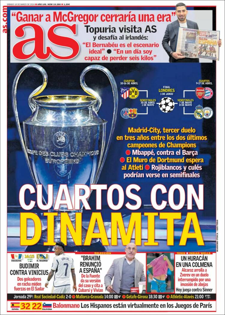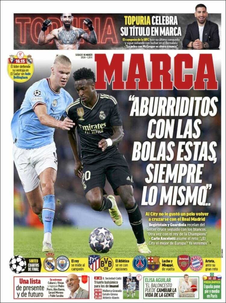 Marca ilustra el anuncio del enfrentamiento con una foto de Vinícius y Haaland, que muy bien podrían ser las dos máximas estrellas de cada escuadra con permiso de Bellingham y De Bruyne. Bellingham y Haaland son íntimos amigos desde sus tiempos en el Dortmund, que por cierto será el rival del Atleti, el más favorecido del sorteo. Flota en el aire la idea de que, considerando que Gil Marín se ha convertido en hombre fuerte de la UEFA, esta Champions podría estar "peligrosamente preparada" para convertirse en la primera de los rojiblancos (donde las dan las toman, Cholo).