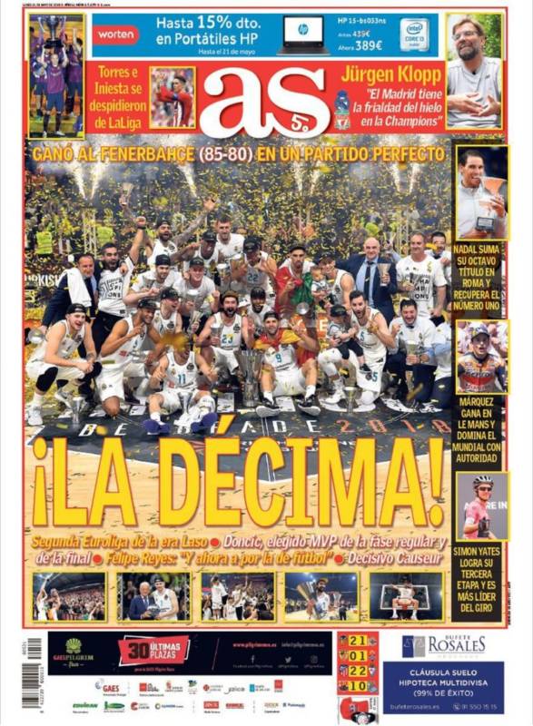 "El Madrid gana con justicia otra Décima". Otra Décima, queridos galernautas. La segunda en menos de un lustro. La Décima en 2014 y la Décima en 2018. Es el Real Madrid, no traten de entenderlo. Es tal la autoridad con la que el club blanco se maneja en Europa que hasta 'Sport' lo resume en su titular sin fobias y sin buscar escándalos que expliquen el éxito merengue. Empiezan a asumir que esto no es flor de un día, que las secciones de fútbol y baloncesto están haciendo un trabajo extraordinario. Han tenido que pasar muchos años y 22 Copas de Europa para que se den cuenta. Nunca es tarde.
