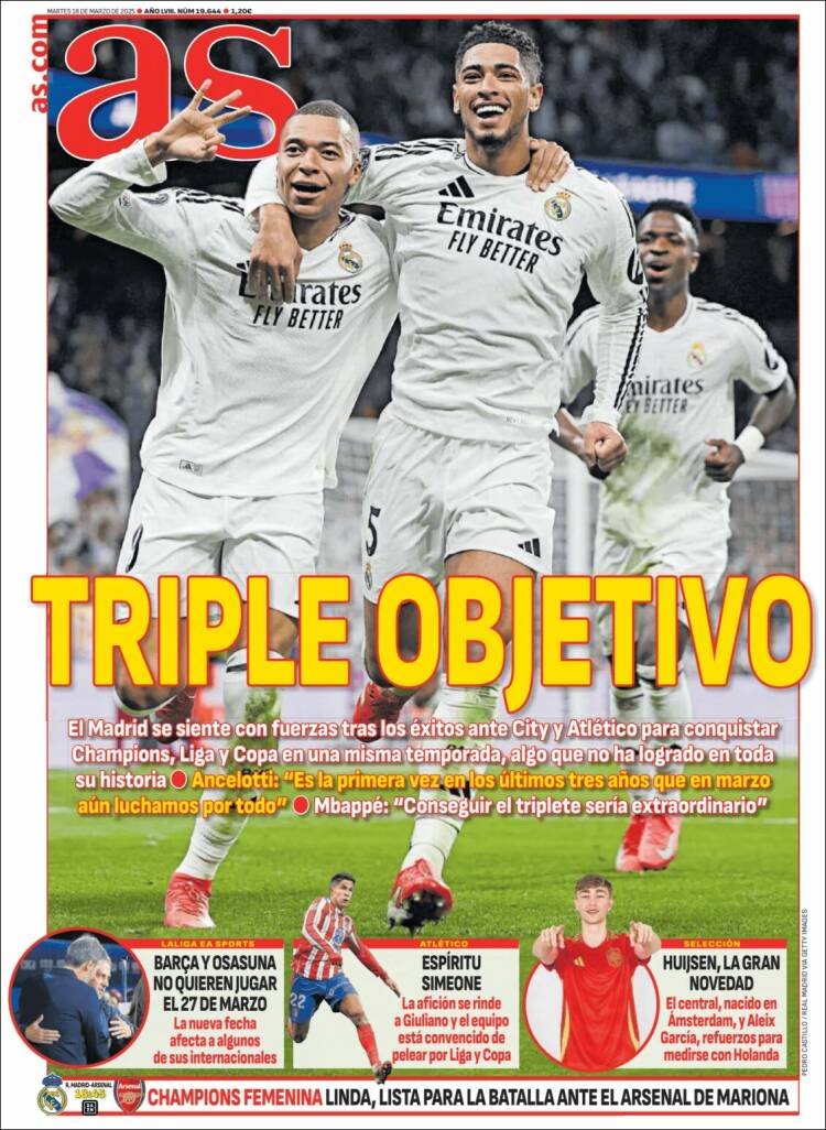 As, que es un periódico que tiene sus cosas pero al menos no pierde de vista que escribe primordialmente para madridistas, aprovecha una foto de Mbappé celebrando su propio triplete, con los tres deditos, para aludir al ambicioso objetivo. Nosotros nos conformaríamos con el premio gordo, que evidentemente es la Champions, más el aderezo siempre agradecible de la Copa, dejando la Mugrienta Liga Negreira para quien se la trabaja, como diría un sindicalista agrario de otros tiempos, es decir, para quien invierte su buen dinero en comprar al CTA y asegurarse de que la herencia de su cúpula directiva siga viva con los actuales jefes del arbitraje, todo ello apuntalado por un videoarbitraje cuyas imágenes controlan sus propios socios y unos horarios puestos por el archienemigo de su rival.