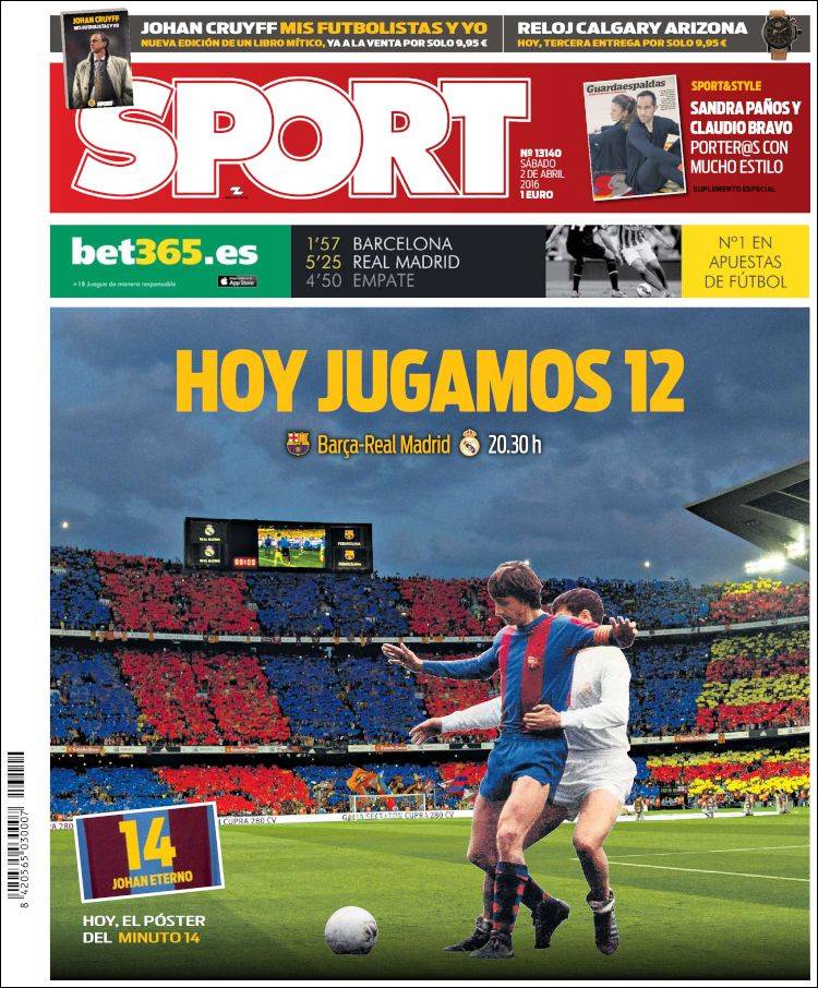 "Hoy jugamos con 12", reza (casi literalmente) el titular de Sport, y queremos creer que se refiere al espíritu, a la influencia, al presente brillo de la ausencia de Johan, y no a eso más prosaico que se suele mentar cuando el árbitro pone de su parte en favor de uno de los equipos en liza. Queremos creer esto y no hay duda de que esa es la intención de Sport, pero reconocemos que temblamos un poco ante la posibilidad de que tras el partido el citado titular cambie su sentido, no porque seamos timoratos o por afán de ponernos parches antes de que suframos herida alguna, sino porque qué les vamos a contar a ustedes que no sepan ya, penaltis y expulsiones mediante, aunque gente como Toni Freixa mire hacia otros lados más fangosos y en ellos retoce.