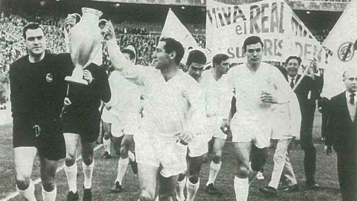 Y de ahí viene mi madridismo. Lo sé ahora, claro. Hace más de cuarenta años uno no estaba para reflexiones. Yo creo que la Historia es la palabra que sustenta la leyenda del Real Madrid. Lo intuí entonces, de niño, pero lo comprendí más tarde. Cuando me entretenía con los libros de mi abuelo viendo aquellas imágenes de don Santiago Bernabéu de joven, con la blanca puesta como jugador, y lo que aquel hombre logró contra viento y marea, algo se removió en mí. Las imágenes de Miguel Muñoz como jugador y entrenador, por ejemplo, las tengo grabadas a fuego. Además don Miguel jugó en el Logroñés, y mi abuelo sabía en qué bar comía unos bocadillos tremendos. O las imágenes de los emigrantes españoles en las ciudades en las que se jugaban las finales de las seis Copas de Europa. Porque de seis se trataba. Un número mágico, pero que parecía inalterable.
