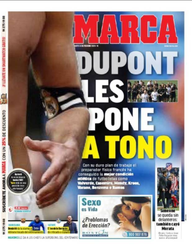 Hoy en Marca simplemente dicen que a los jugadores madridistas “DUPONT LES PONE A TONO”, a propósito del preparador físico. Una dosis farmacéutica de sicalipsis con esbozo de torso y brazo completo con brazalete de atleta. ¡Ah!, queridos amigos. Qué Dupont ni Dupont, si esto ya lo decía Pep: ¡Son atletas!