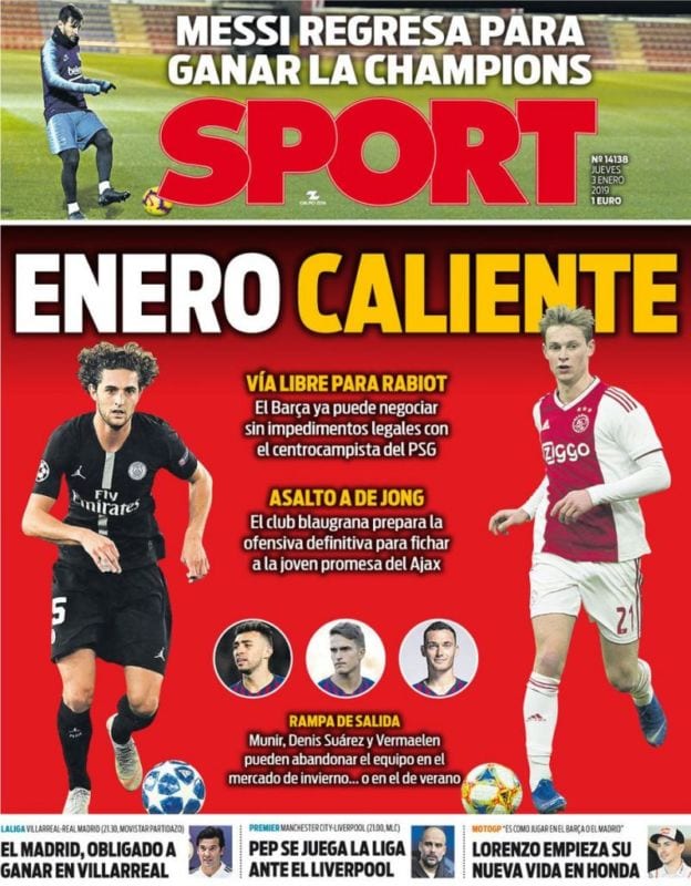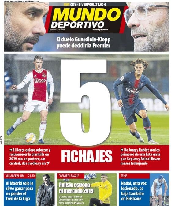 "Messi regresa para ganar la Champions", advierte 'Sport'. Están obsesionados con esa competición que luego desprestigian en mayo/junio cuando la gana el Real Madrid. Dicho esto, nos parece bien lo de Messi, pero tendrá que esperar a febrero. "Cinco fichajes", apunta 'Mundo Deportivo'. Otra oda a la cantera. La Masía está en auge.