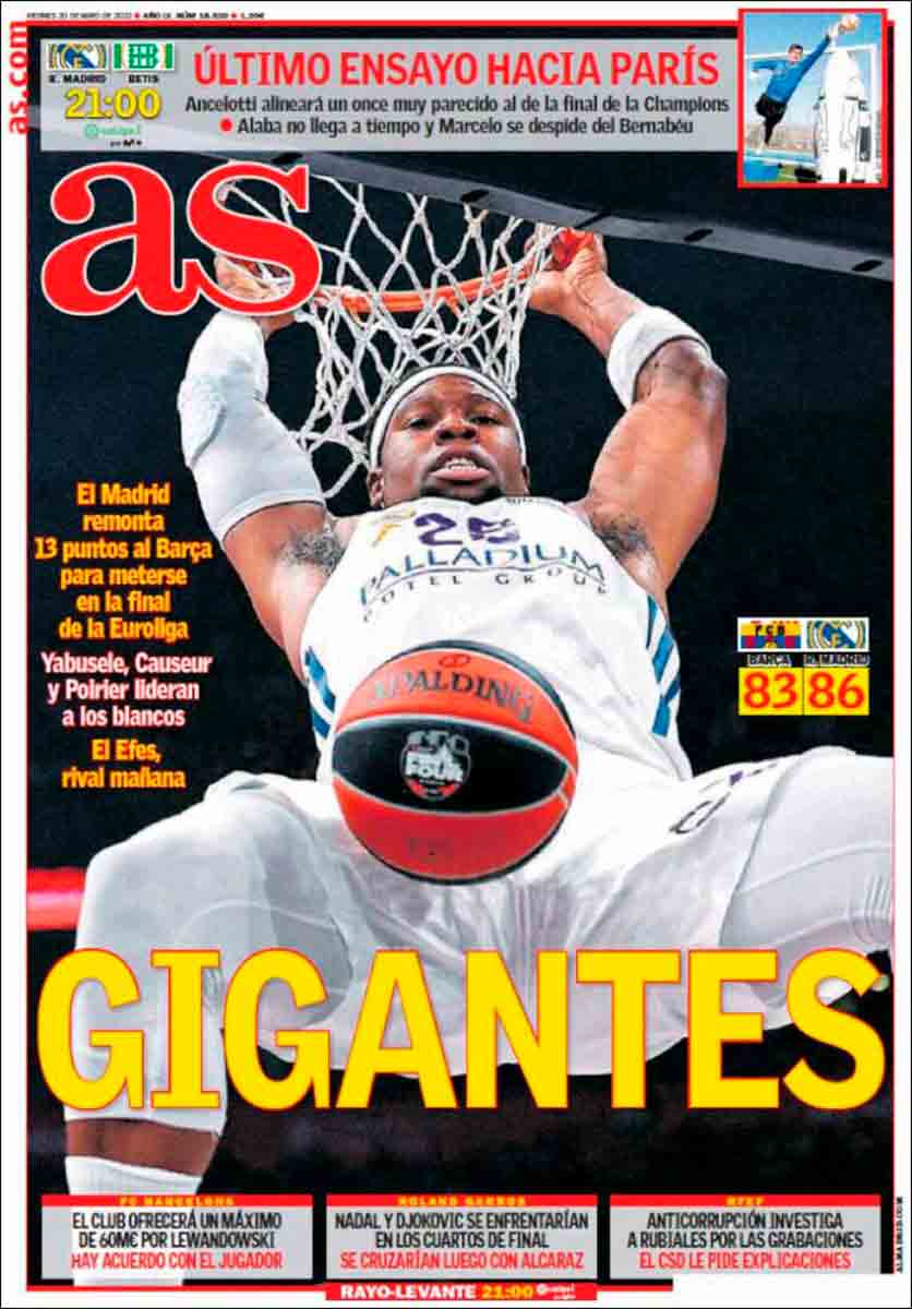 5. Alegrón gigante por lo que hicieron ayer los chicos de Laso. Impresionante. Tiene mucho mérito porque la situación era critica. Todavía lo es. Pero ahí están, en otra finalísima. En cuanto a lo de Kylian, no me afecta. Ni siento ni padezco porque nunca me he creído nada de lo que rumorean aquí y allá. Aprendí desde muy joven que la piel del oso no se puede vender antes de cazarlo. Si viene, bienvenido sea; si se queda en París, pues allá él. Nosotros a lo nuestro. Un par de años de Lewandowski hasta que Erling se desengañe del MC no lo vería con malos ojos. Tendríamos que atacar por ahí.