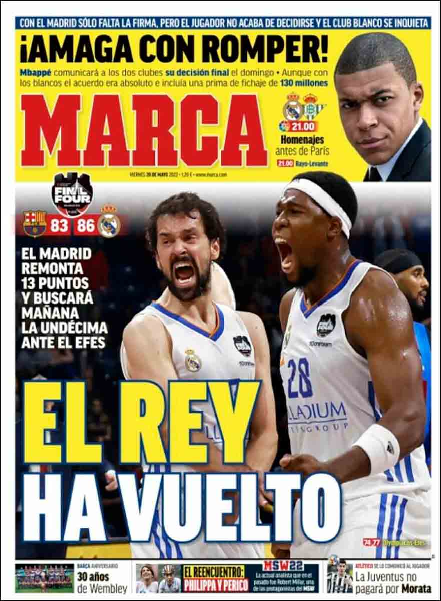 En lo que respecta a Marca, divide su primera plana entre la gesta de los de Laso y el asunto Mbappé, sobre el cual a estas horas ya solo tenemos una cosa que decir: chaval, haz lo que quieras. Si vienes, será un puntazo. Si no vienes, tú te lo pierdes. Necesitas a este Real Madrid de que estamos hablando mucho más de lo que el Real Madrid te necesita a ti. Pero no te equivoques: para el error que se perfila en el horizonte, esta vez, no habría marcha atrás.