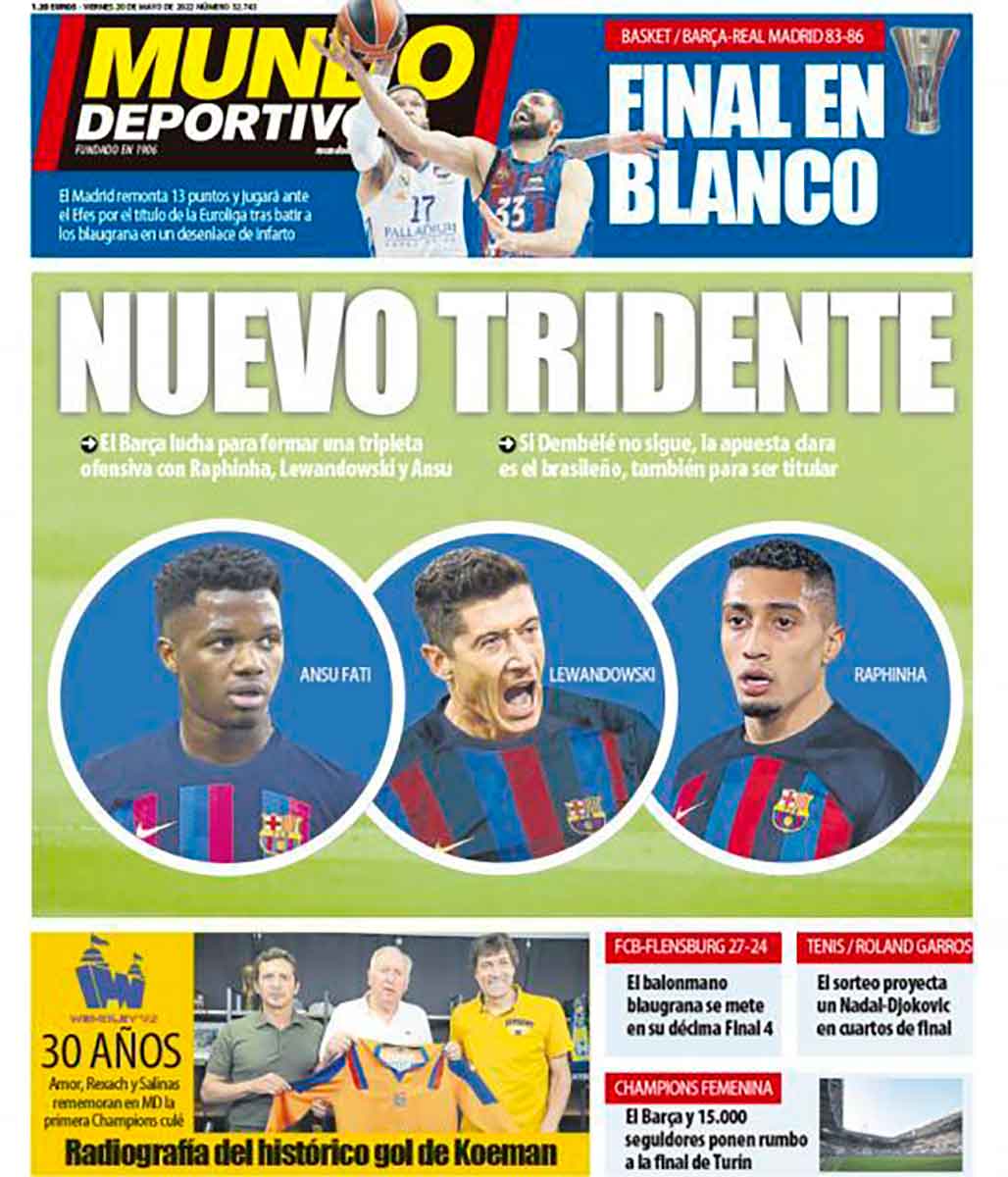 Las portadas cataculés, como era previsible, ahogan todo lo posible la derrota en baloncesto, la sepultan entre otras cositas, fichajes más o menos quiméricos y la posible renovación de Dembélé, que se ha despertado de aquella eterna siesta en un aeropuerto justo cuando acaba su contrato. Pues habrá que renovarlo, ¿no? Y lo malo es que no parece que quiera, lo que a su vez arreglaría la agenda de Laporta para el día previsto para la firma, donde también y a la misma hora se espera a Jan en la inauguración de un gimnasio en Casteldefels.