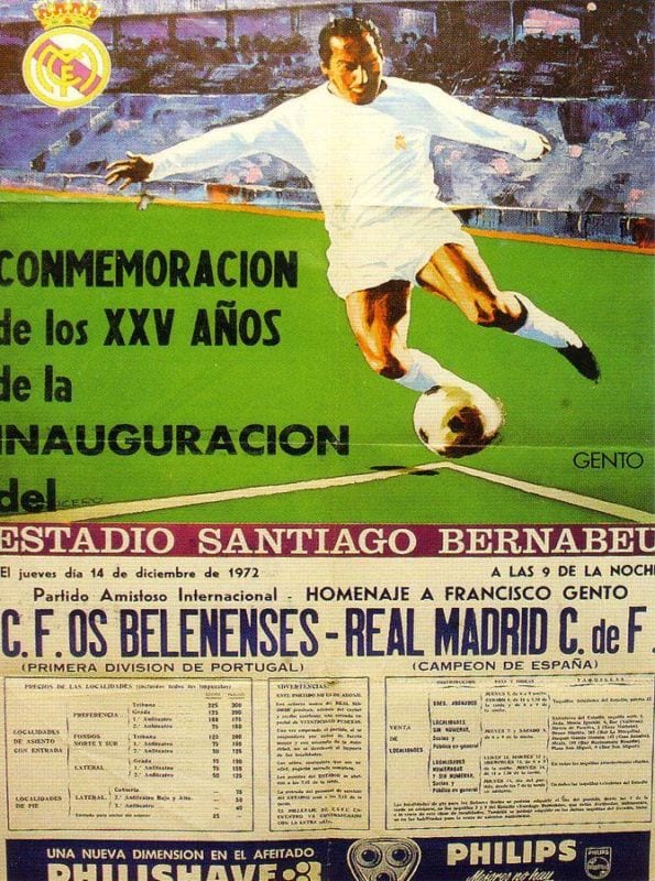 Recuerdo que mi primera visita – la tengo memorizada como tal, puede que hubiera alguna anterior – fue el 14 de diciembre de 1972, en el segundo homenaje a nuestra querida “Galerna del Cantábrico”, Paco Gento. Homenaje a Don Paco – hubo un primero en 1965 – que, además, coincidía con el 25º aniversario de la inauguración del estadio y, curiosamente, ante el mismo rival que en 1947, el entrañable Os Belenenses portugués. Aquella fría noche de invierno fui al estadio con mis padres y muy orgulloso al poder portar mi recién estrenada camiseta blanca inmaculada, sin publicidad y tan solo con el escudo en dorado, y con el número 7 de mi ídolo Amancio a la espalda.
