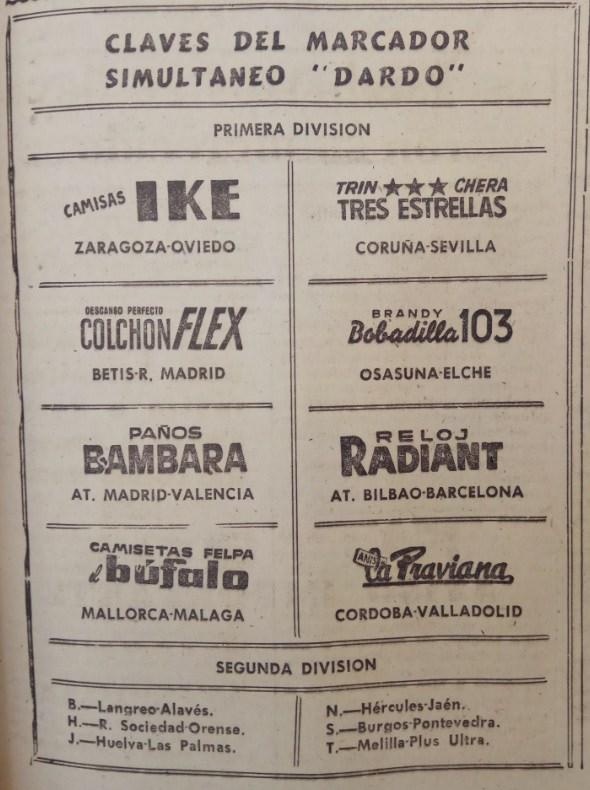 Dentro del estadio, quienes no llevaban los pesados transistores podían seguir los demás partidos por medio del “Marcador simultáneo Dardo”, en el que varias empresas esponsorizaban el campeonato nacional de Liga: para poder enterarse de algo, había que llevar al estadio las claves de ese domingo – salían en todos los periódicos del domingo, como en ABC o en el “Ya” - de tal manera que el partido “Camisas IKE” era el Córdoba-Atlético de Madrid y “Relojes Radiant” correspondía al Valencia-Oviedo.