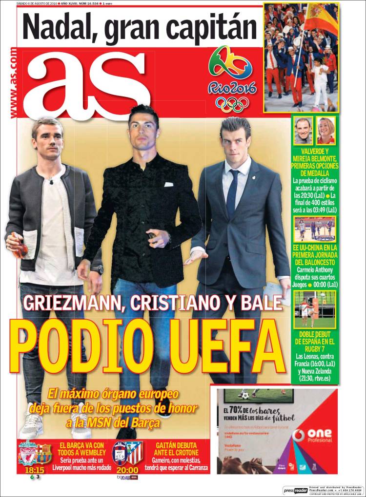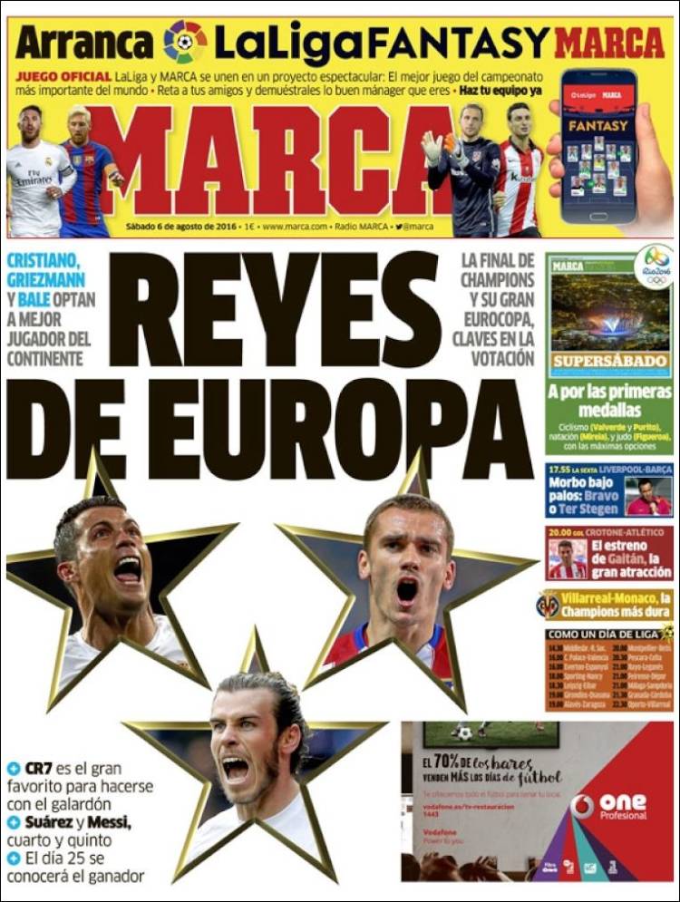 Por lo menos, de ese modo típicamente sutil que es todo lo contrario a la sutileza, el trío principal que opta al premio no empieza por Cristiano en la portada de As, sino por Griezmann, este sí, un jugador de fútbol con todas las de la ley, incluidos sus márgenes cholistas. Después, en claro orden descendente en cuanto a relación con el deporte del que hablamos, aparece Cristiano y, al final -ya tal, que diría Rajoy- Gareth Bale. Gracias, Relaño, por intentar poner un poco de cordura en todo esto. Los poderes fácticos parecen irreductibles -léase en este caso la UEFA y, en todos los casos, el florentinismo-, pero por nosotros no va a quedar. Dormir con la conciencia tranquila es lo mínimo que merecemos los que aún luchamos por un fútbol libre de goles del Madrid.