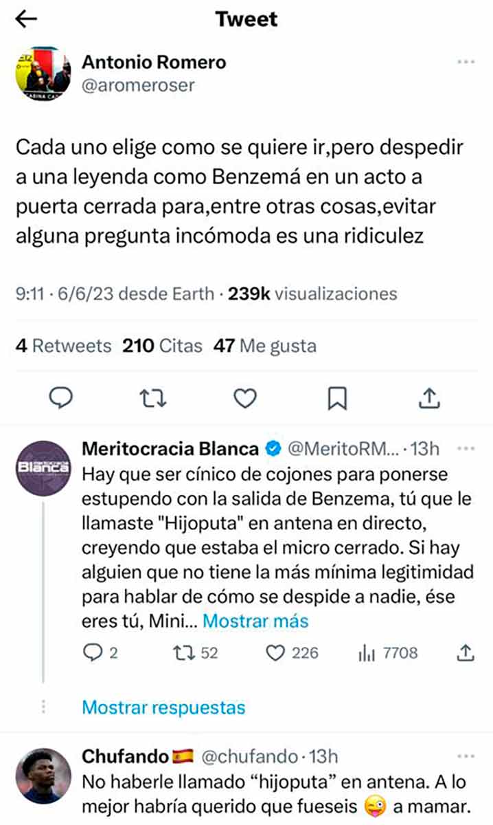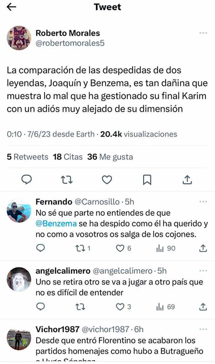 Roberto Morales es otro que tiene serias objeciones a la despedida de Karim y la compara desfavorablemente con la de Joaquín, seguramente porque fue más lacrimógena y Pedrerol campaba en ella por sus respetos. Pretender que Joaquín y Benzema tengan que tener una despedida parecida seria como pretender que Joaquín y Benzema sean parecidos, y con eso intuimos que está dicho todo. Por lo demás, Benzema se va a jugar Arabia y Joaquín se va a su casa, lo que también da una medida del diferente tono de los actos.