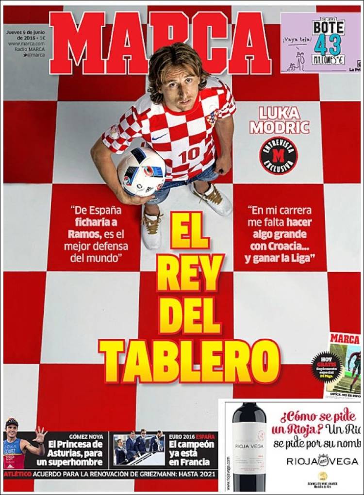 Menos mal. Por fin hemos llegado a casa gracias a esta estupenda portada de Marca, en fondo y forma. Modric nos mira desde abajo, posando en un tablero de ajedrez rojo y blanco según mandan los colores de su Croacia natal, pero todos sabemos que en realidad Modric nos mira desde arriba, aunque nunca por encima del hombro. Modric no juzga, sino que absuelve. Luka es el ojo que todo lo ve en el campo, es el pivote, la clave de bóveda, el arquitecto y hasta el maestro de obra.