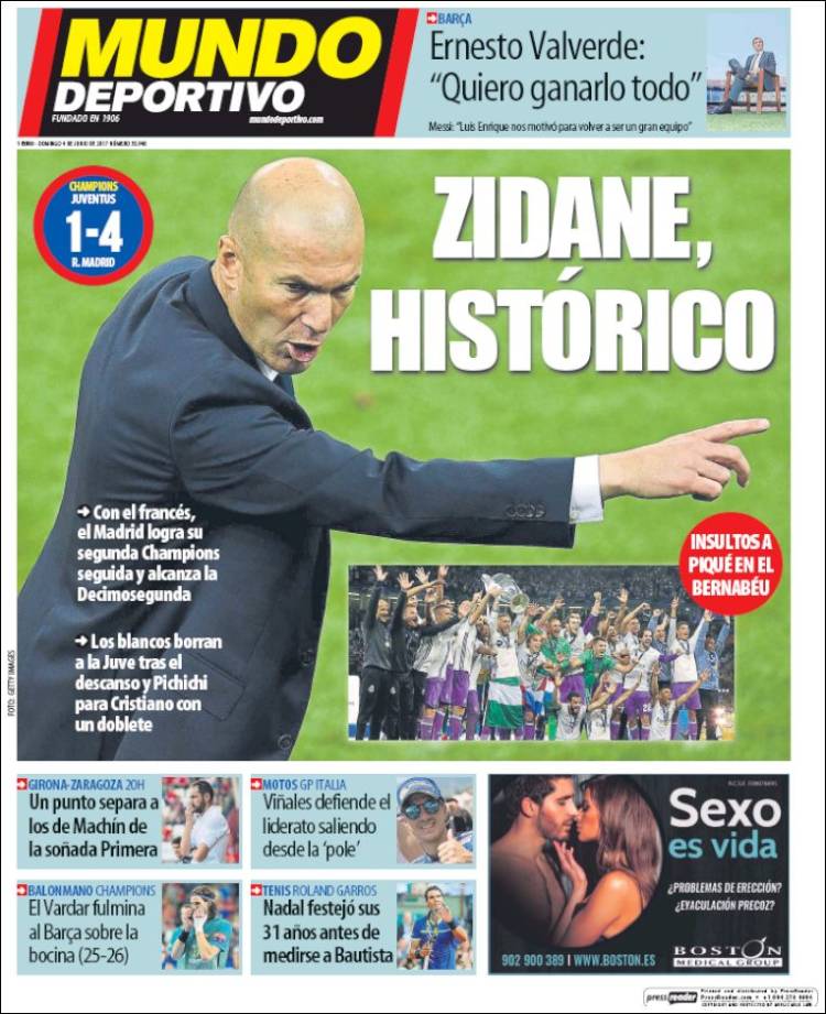 6. La final de ayer fue la mayor exhibición de las copas madridistas en color. Enfrente había un señor equipo como la Juventus al que se minimizó y borró del campo en una segunda parte majestuosa. Zidane está escribiendo historia viva del fútbol.