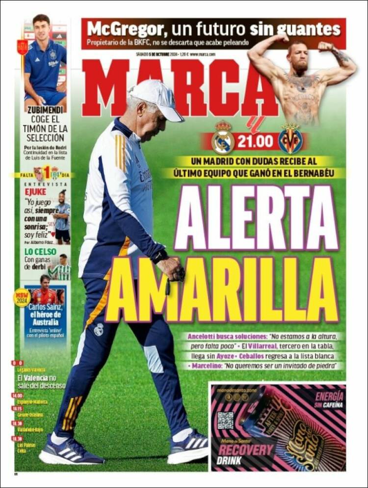 El diario Marca continúa con sus juegos de colorines: a la noche negra del miércoles sucede la “Alerta amarilla” de hoy. Nunca se pusieron rojos al poner verde al club blanco, y se pondrán morados hoy si los nuestros tienen una noche gris ante los amarillos dirigidos por Marcelino. El asturiano es uno de esos entrenadores al que se aprecia ya su estado de sobreexcitación ante el partido del año para su equipo, un encuentro en el que pide a los suyos que lo den todo. Curioso contraste con los abrazos y sonrisas con los que regala a los entrenadores de otros clubes cuando cae derrotado.