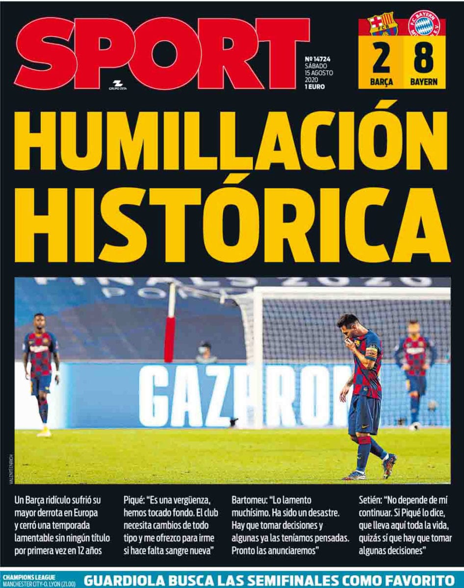 En Sport simplemente salen con otra HUMILLACIÓN HISTÓRICA. En realidad, no sabemos lo que esperábamos, pero ahora se nos hacen baratijas estas portadas que veíamos al principio como alhajas. Supongo que era la expectación. Seguramente porque la verdadera alhaja es el 2-8, queridos galernautas, el 2-8 como una pequeña gema de valor incalculable. 2-8, 2-8, 2-8. Qué sonoridad. Parece un número de información telefónica. Llamad al 282828, seguro que os contesta alguien de muy mala gana que os dice que os habéis equivocado.