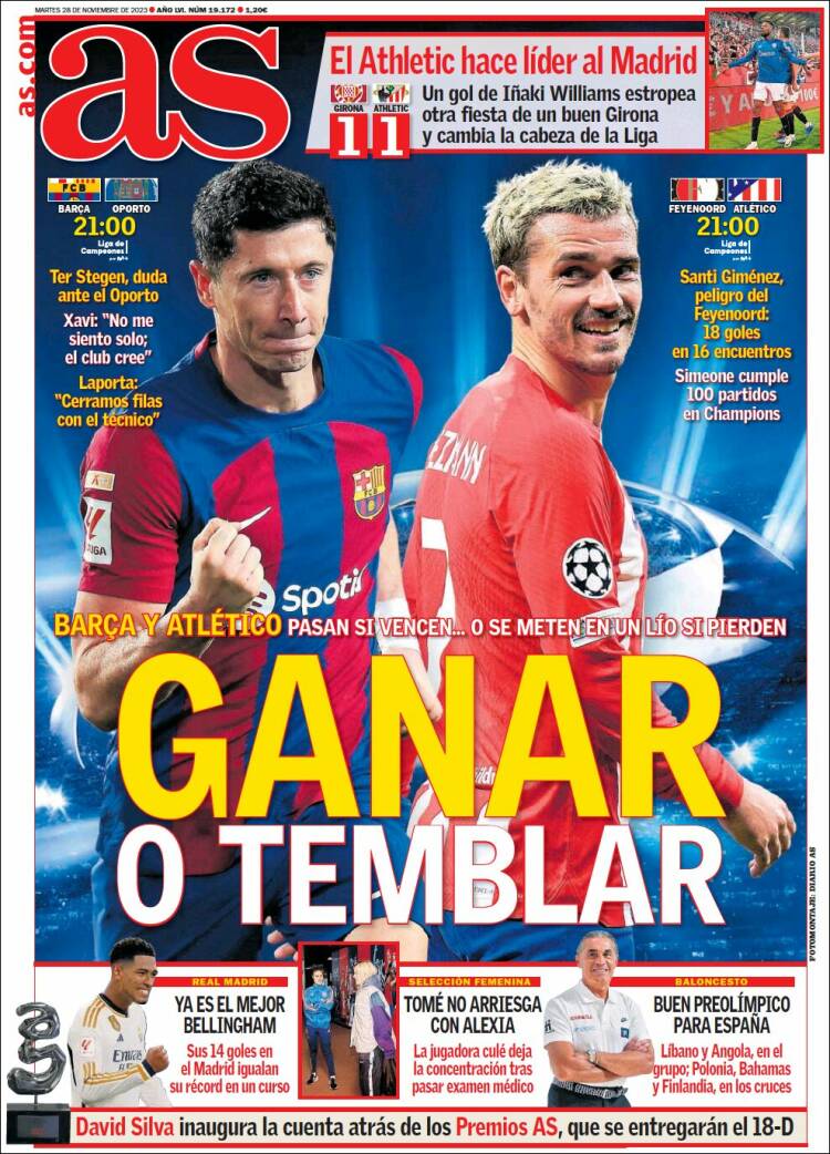 As sigue la misma senda de central lechera, Lewandowski y Griezmann, Barça y Atleti a todo color. Destacan que ambos se clasifican para octavos de Champions si vencen y se meten en un lío si pierden. «Ganar o temblar» es el encabezamiento, ideal para título de película de sobremesa de Antena 3.