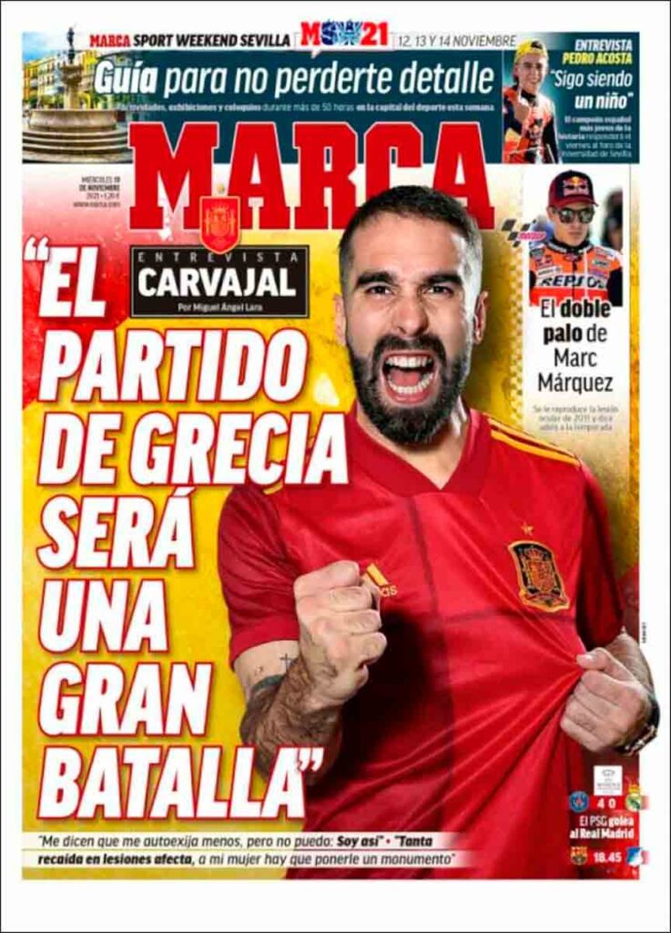 Marca trae a Carvajal, que vuelve a la selección en este nuevo y nefando parón. Nos alegramos por él. Gran jugador Dani, de palmarés similar al de Casemiro, pero (ay) algo zoquete en la interiorización de lo de la variable espacio-tiempo en el medio campo. Y eso pues como que qué queréis que os digamos: le resta mucho predicamento a la hora de aspirar a ser un verdadero grande del fútbol. Tú gana títulos pero no te apliques en lo del espacio-tiempo y ya verás qué poco tarda en personarse el páter Xavi (o Javi, como cariñosamente le llama Ancelotti) para darte con la regla en los nudillos.