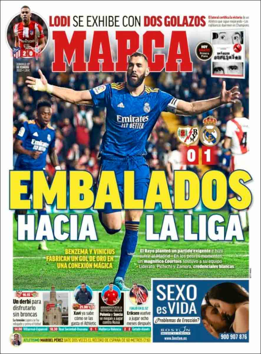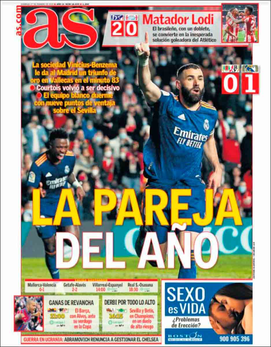 La otra pareja de portadas, la madrileña, viene con el partido del Madrid en Vallecas como asunto central y con la pareja Benzema-Vini como asunto central dentro del asunto central. No podemos sino agradecer a la primera pareja (la de portadas) que destaque como merece el trabajo y la eficacia de la segunda pareja (de jugadores), y no podemos sino agradecer aún más que la segunda pareja esté rindiendo a este nivel esta temporada.