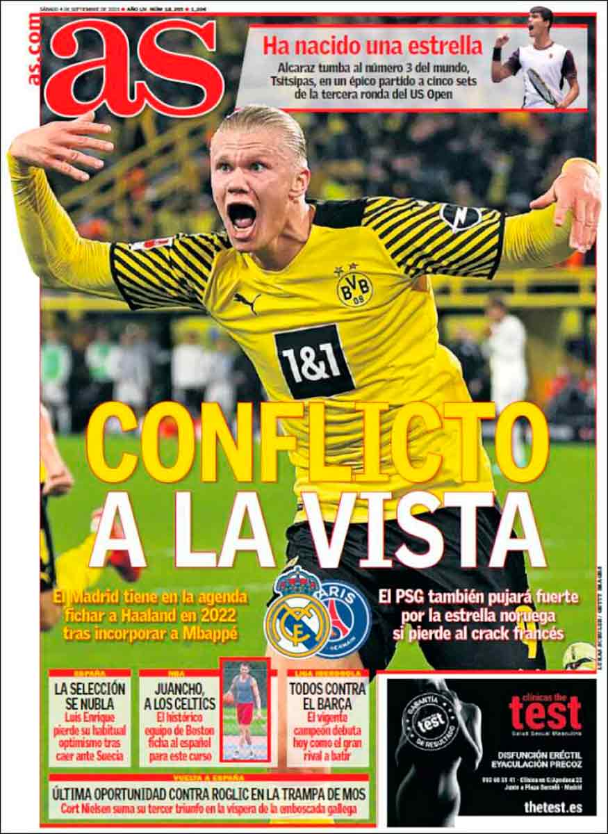 Al menos AS sí tuvo los reflejos de colocar en portada la gesta del imberbe Carlos Alcaraz en el US Open ante Stefanos Tsitsipas esta madrugada. Otros debían estar en brazos de Morfeo o preparando a la mona para dormirla mañana, léase hoy.