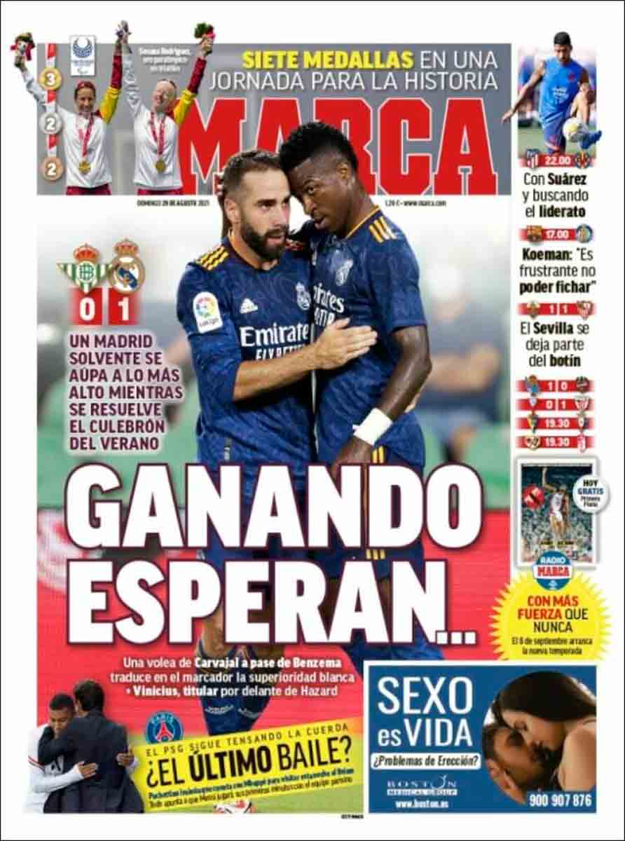 "Ganando esperan...", titula Marca. Y esos puntos suspensivos son estas horas, estos días, o tal vez estos meses hasta la llegada de Mbappé. Mientras tanto, se hace necesario seguir ganando y se hace necesario corregir algunos desajustes defensivos y perseverar en la intensidad que señaló Ancelotti tras el partido contra el Betis.
