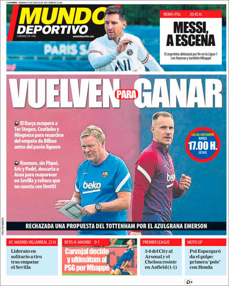Con el viento se fue Messi, al que siguen llamando en las portadas culés, como quien precisa de sus fantasmas para seguir viviendo, noqueados, narcotizados, como quien ya no puede seguir adelante más que arrastrando sombras y pasados y voces arrebatadas por el destino cruel. "Todo listo para el debut de Messi", reza Sport. "Messi, a escena", reza Mundo Deportivo. Sufren una especie de síndrome de Estocolmo en Barcelona que pasa por París. No saben qué ha pasado. No se lo explican. Se acostumbraron a respirar por los poros de Messi y ahora estallan de falta de aire. Messi era el capitán, el barco, el mar, el faro y el puerto, y ahora no hay más rumbo que un remedo barato del monólogo de Segismundo, un "ay, mísero de mí" de melodrama sobreactuado.