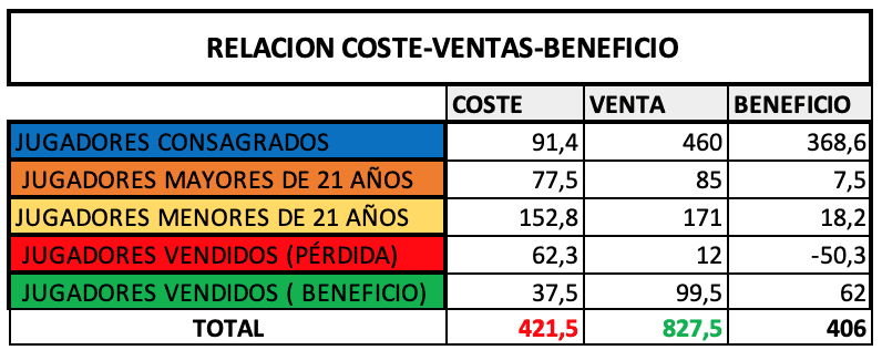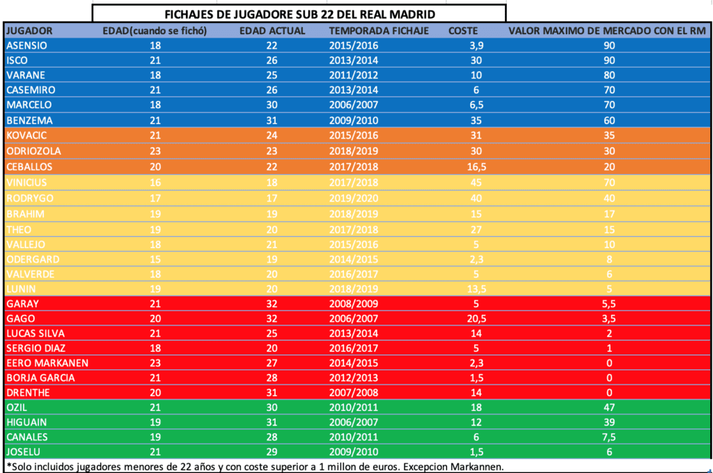 Evidentemente, los jugadores que siguen en activo en el Real Madrid (color azul, naranja y amarillo) no pueden ser evaluados objetivamente, aunque en la tabla hago una simulación con su venta a un valor estimado (portal Transfemarkt). Y observamos que si se hubiesen vendido esos jugadores en su mejor momento, el beneficio habría sido enorme. Eso no es otro que el beneficio deportivo que esos jugadores ya han aportado y están aportando en la actualidad.