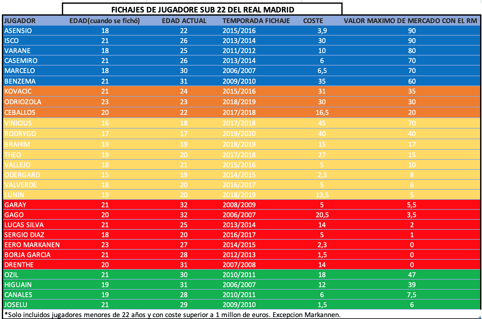 *No he incluido en la tabla a canteranos formados directamente en el Castilla como pueden ser Carvajal o Nacho, no fichados a otro club en ningún momento de su etapa profesional (a partir de los 15-16 años)