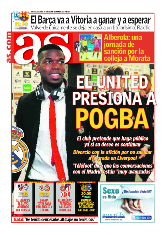 "Las conversaciones con el Madrid están muy avanzadas", asegura 'AS' nombrando a 'Telefoot'. No sabemos si se trata de las conversaciones con el Manchester United, con el propio Paul Pogba, con el entorno del jugador o con algún aficionado que pasaba por allí. También cabe la posibilidad que sea algo parecido al libro de Javier Pérez Andújar titulado 'Paseos con mi madre'.