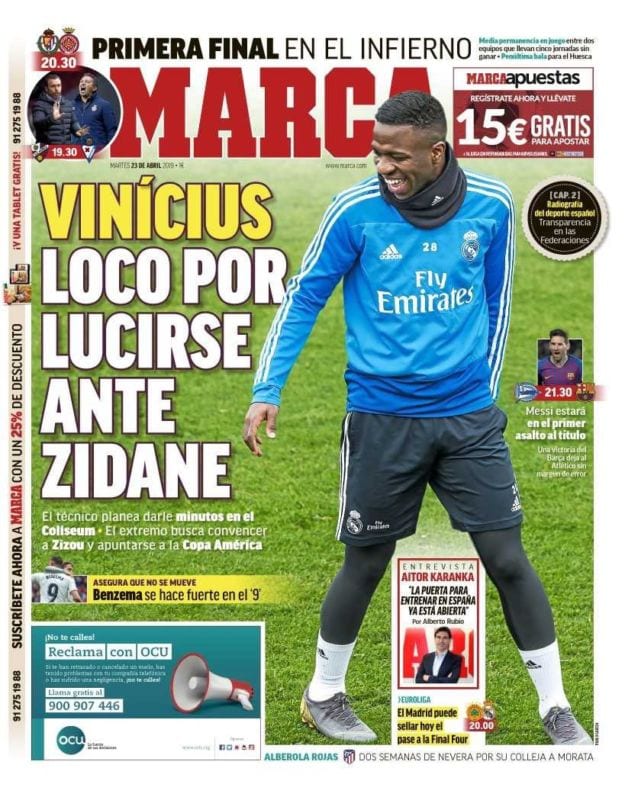 En el resto de portadas vemos que el Barcelona ya se prepara para el alirón -insertar emoticono de rabia- y que Vinicius tiene ganas de lucirse ante Zidane. Lo cierto es que nosotros también tenemos ganas de reencontrarnos con el brasileño, al que echamos muchísimo en falta. Sabemos que está allí, como el famoso libro de Laura Brodie, pero queremos dejar de saber o intuir para empezar a ver. Queremos verte, Vini. Y que sea cuanto antes, por favor.