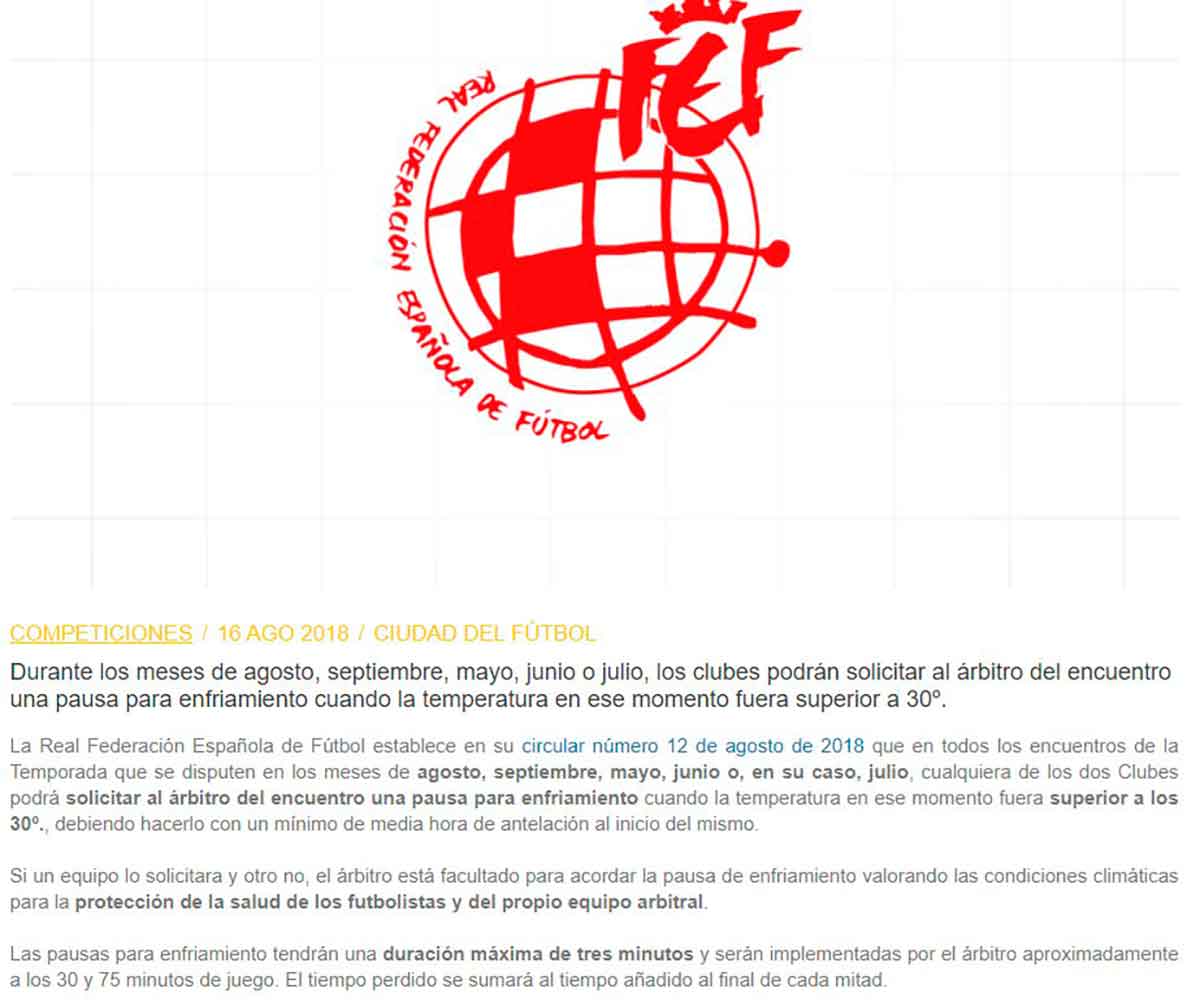 Aunque al parecer, lo que reza la circular, es decir, lo que está escrito, no es lo que se aplica. Lo que se aplica es que con 30° la pausa es obligatoria, pero entre 26° y 29° es suficiente con que haya consenso entre equipos y árbitro, que tampoco fue lo que sucedió en el Atlético de Madrid-Osasuna, pues la temperatura en aquel momento también era inferior a 26°. Eso (lo de los 26 y 29 grados) es al menos lo que dice Iturralde, aunque no sabemos de qué fuente reglamentaria lo extrae.