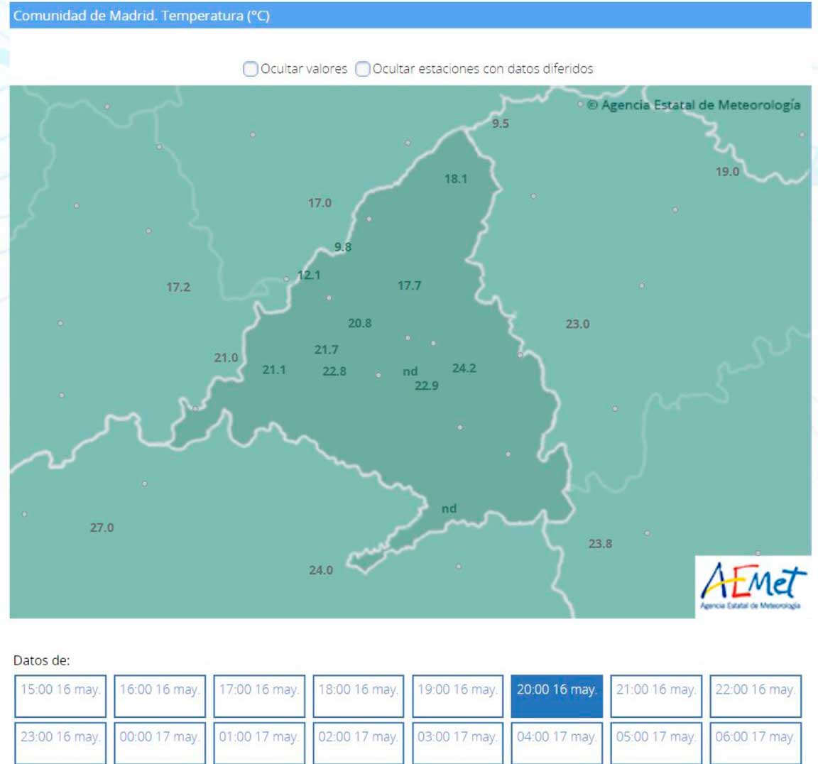 «Los clubes podrán solicitar al árbitro del encuentro una pausa para enfriamiento cuando la temperatura en ese momento fuera superior a 30°». Empezamos bien, la temperatura en Madrid el domingo a las ocho de la tarde era de 23° aproximadamente. Ni se acercaba a los 30°. Esa diferencia de 7° es palpable a pelo, sin necesidad de termómetro, cualquier persona al aire libre diferencia con claridad que 23° no son 30°, ni se asemejan. No hay lugar a duda alguna. Pero por si acaso ved un mapa de las temperaturas en Madrid en esa fecha y hora.